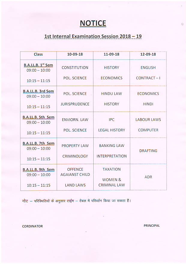 माधव विधि महाविद्यालय के सभी छात्र - छात्राओ को सूचित किया जाता है बी.ए.एलएल.बी. की आतंरिक परीक्षा दिनांक 10 सितम्बर से प्रारंभ हो रही है .