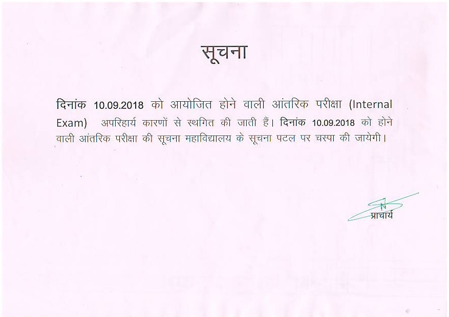 दिनांक 10-09-२०१८ को आयोजित होने वाली आंतरिक परीक्षा अपरिहार्य कारणों से स्थगित कि जाती है.
