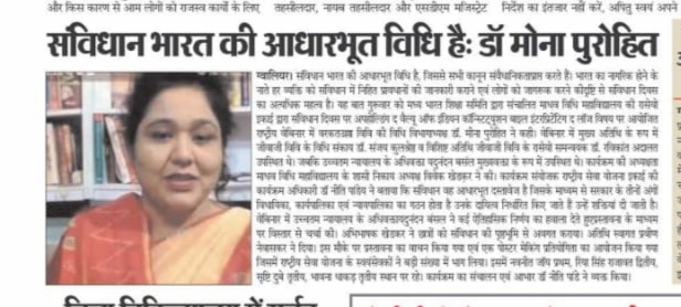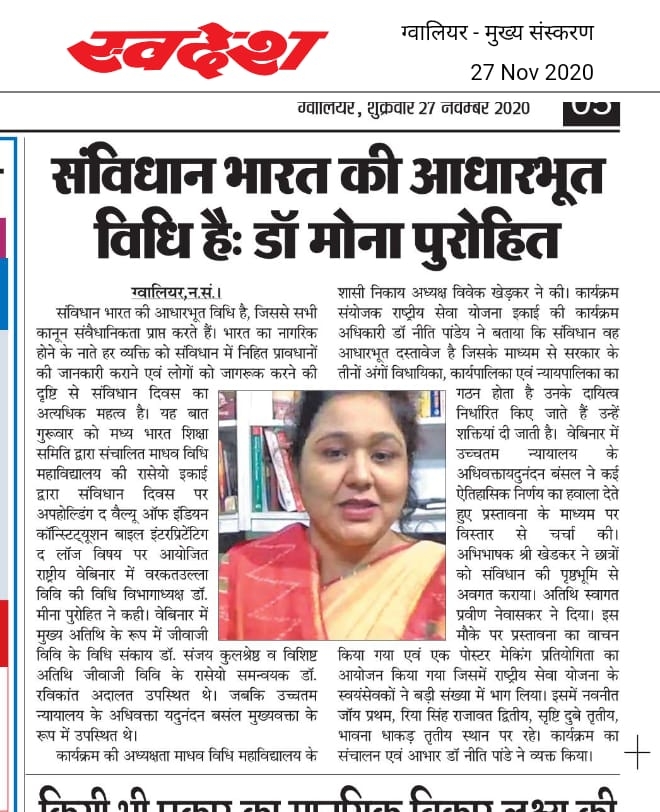 माधव विधि महाविद्यालय में राष्ट्रीय सेवा योजना द्वारा संविधान दिवस के पावन अवसर पर ''अपहोल्डिंग द वैल्यू ऑफ इंडियन कॉन्स्टिट्यूशन बाइल इंटरप्रिटेटिंग द लॉज'' शीर्षक पर राष्ट्रीय सेमिनार का आयोजन किया गया। जिसके मुख्य वक्ता डॉ मोना पुरोहित, डीन फैकल्टी ऑफ लॉ एवं श्री यदुनंदन बंसल एडवोकेट उच्चतम न्यायालय थे।