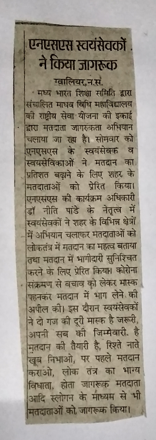 आइक्यूएसी सेल के सुपरविजन में माधव विधि महाविद्यालय की राष्ट्रीय सेवा योजना इकाई द्वारा मतदाता जागरूकता अभियान चलाया गया। माधव विधि महाविद्यालय की प्राचार्य डॉ नीति पांडेय जी (एन. एस.स. कोऑर्डिनेटर) के मार्गदर्शन में किया गया।