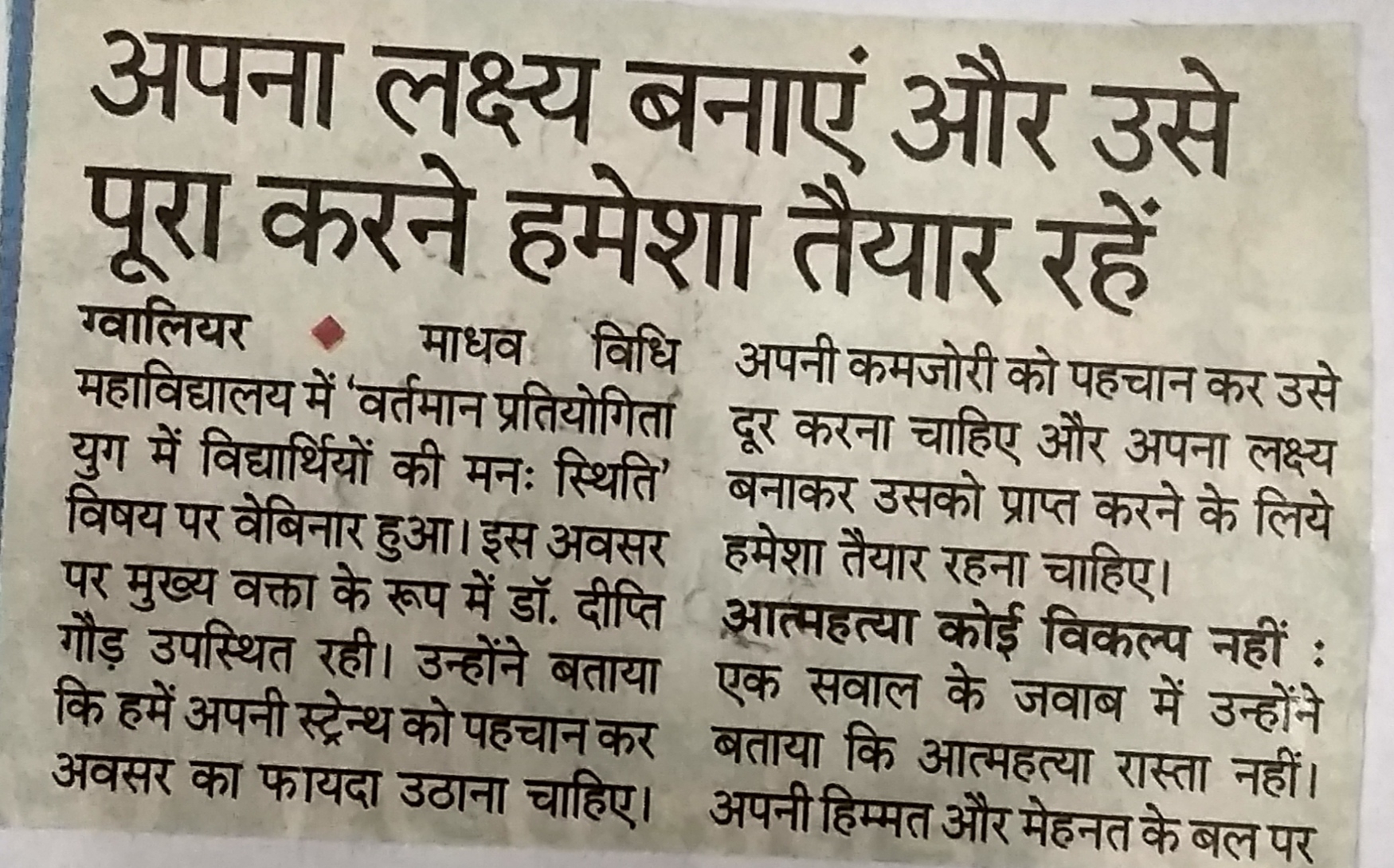 आइक्यूएसी सेल के सुपरविजन में माधव विधि महाविद्यालय में दिनांक 24/10/2020 को वर्तमान प्रतियोगिता युग में विद्यार्थियों की मनःस्थिति विषय पर वेबीनार किया गया। इस अवसर पर मुख्य वक्ता के रूप में डॉ दीप्ति गौड़ उपस्थित रहीं।