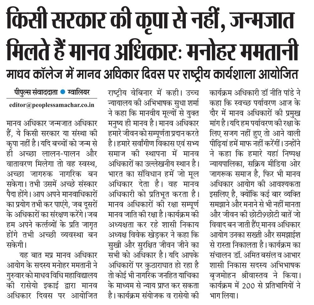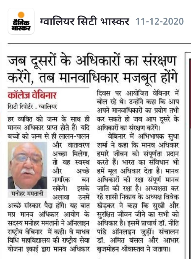 आइक्यूएसी सेल के सुपर विजन में माधव विधि महाविद्यालय में राष्ट्रीय सेवा योजना इकाई के द्वारा दिनांक 10/12/2020 को मानव अधिकार दिवस पर राष्ट्रीय कार्यशाला का आयोजन किया गया। इसमें मुख्य वक्ता के रूप में मध्यप्रदेश मानव अधिकार आयोग के सदस्य मनोहर ममतानी जी एवं एडवोकेट सुधा शर्मा जी उपस्थित रहे।