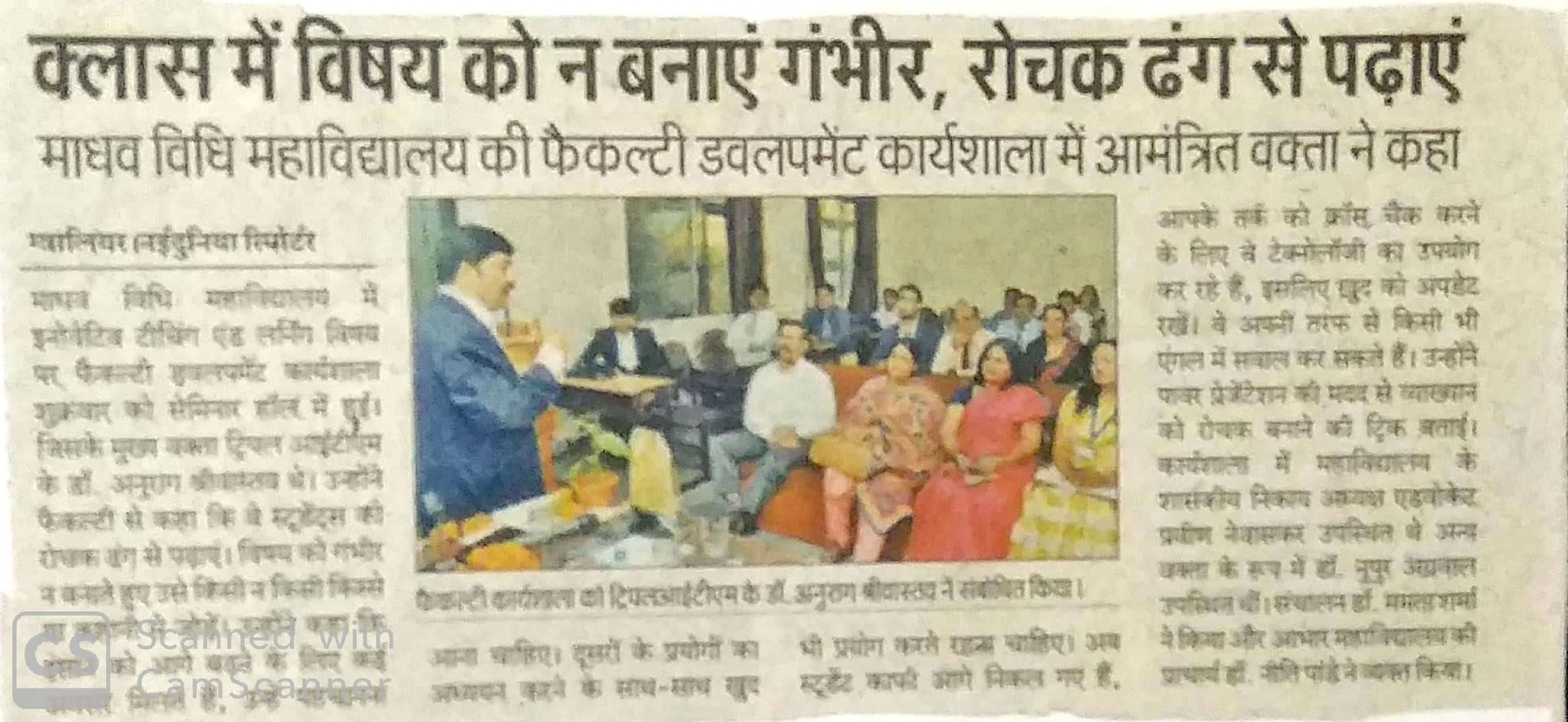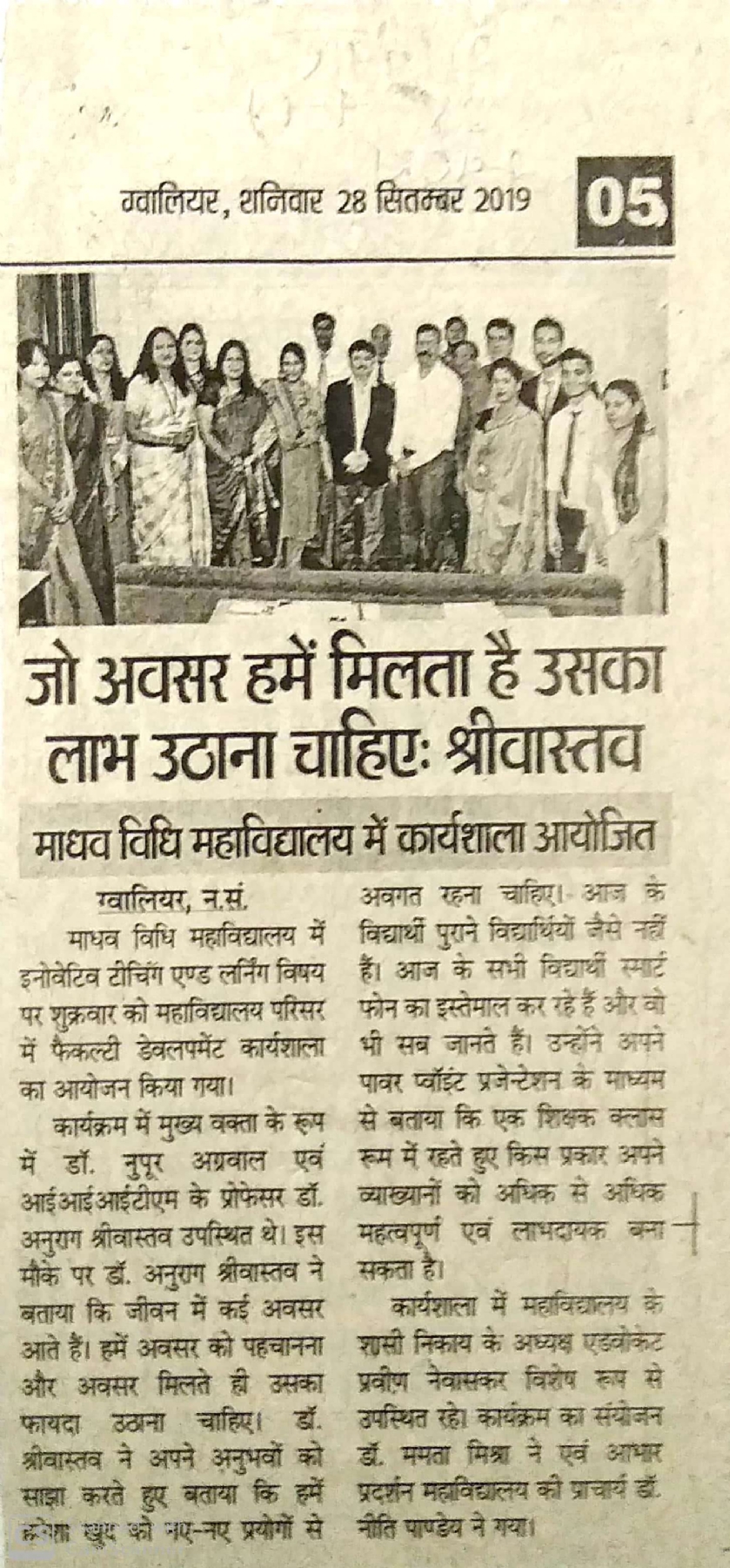 आइक्यूएसी सेल के सुपर विजन में माधव विधि महाविद्यालय में दिनांक 27/9/2019 को टीचिंग एंड लर्निंग पर फैकल्टी डेवलपमेंट कार्यशाला का आयोजन किया गया जिसमें मुख्य वक्ता के रूप में डॉ अनुराग श्रीवास्तव (ट्रिपल आईटीएम) उपस्थित रहेl