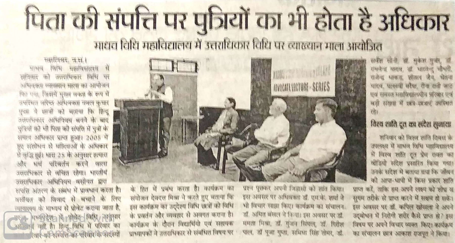 आइक्यूएसी सेल के सुपरविजन में माधव विधि महाविद्यालय में दिनांक 21/9/ 2019 को अधिवक्ता व्याख्यानमाला का आयोजन किया गया जिसमें मुख्य व्यक्ति के रूप में अधिवक्ता नवल कुमार गुप्ता जी उपस्थित रहे।