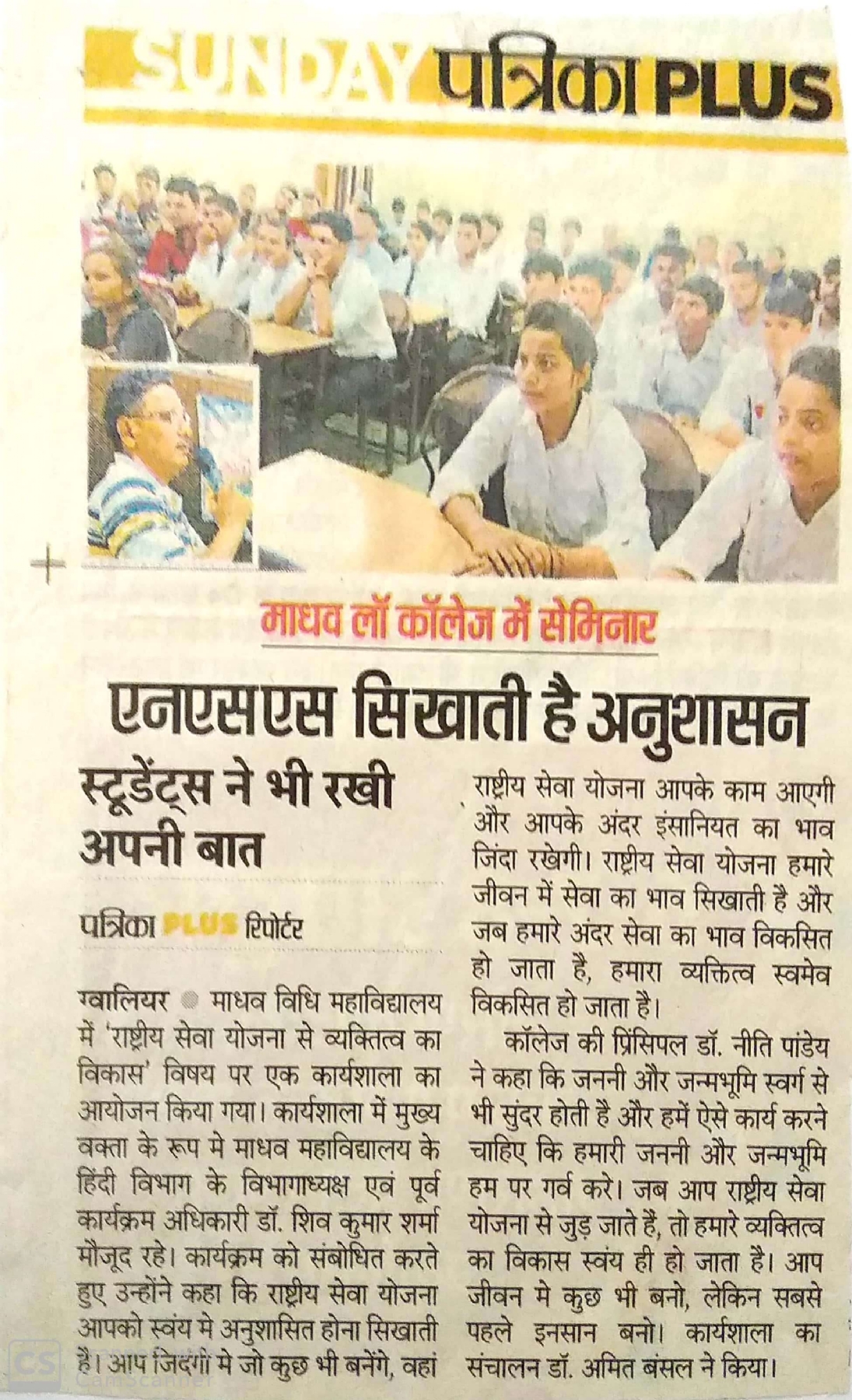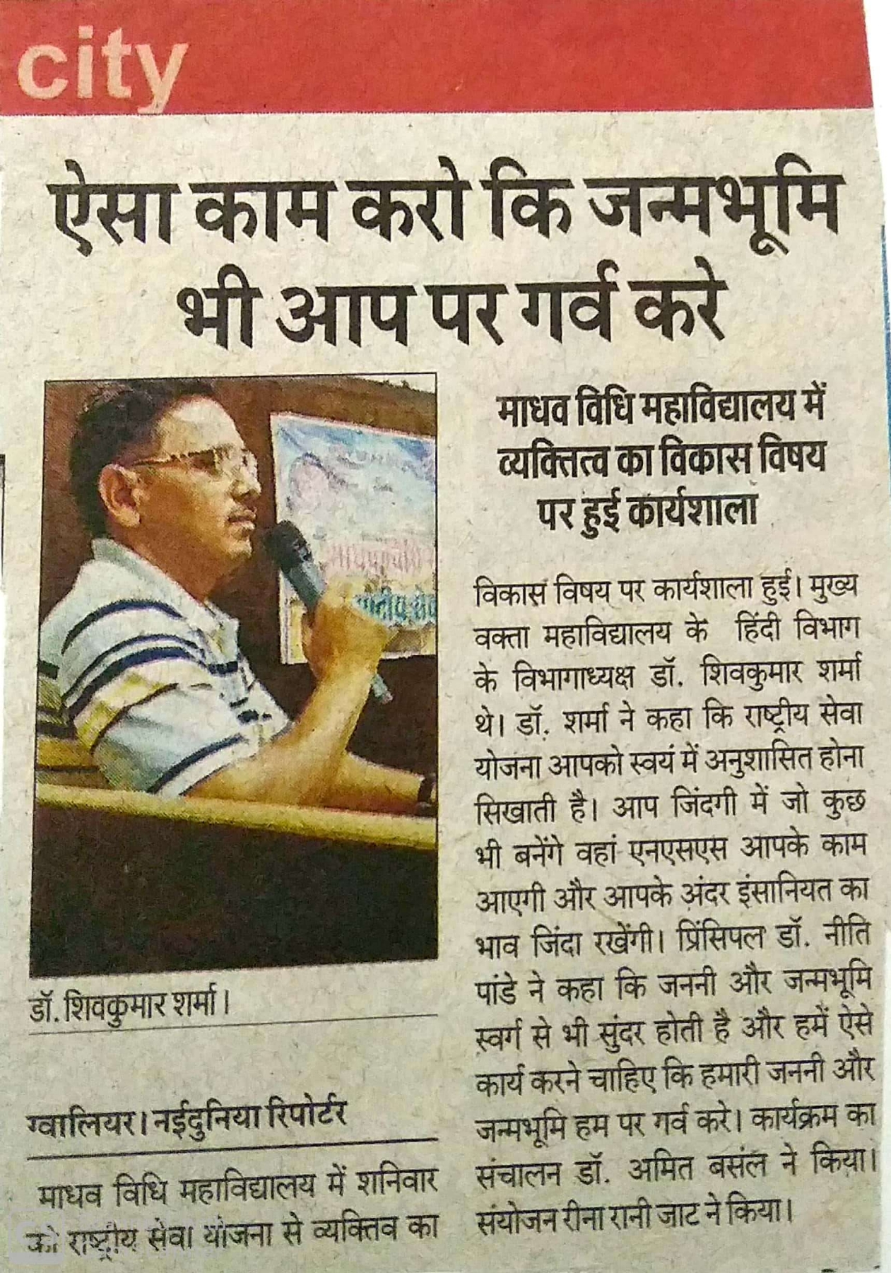 आइक्यूएसी सेल के सुपर विजन में राष्ट्रीय सेवा योजना इकाई के द्वारा माधव विधि महाविद्यालय में दिनांक 28/9/ 2019 को व्यक्तित्व विकास पर कार्यशाला का आयोजन किया गया है जिसमें मुख्य वक्ता के रूप में डॉ शिवकुमार शर्मा जी उपस्थित रहे।