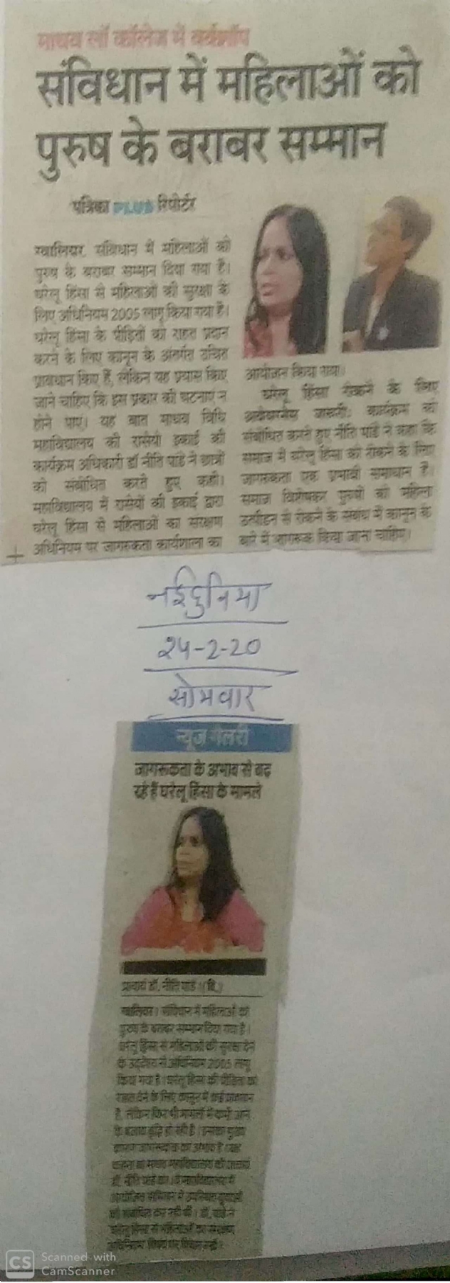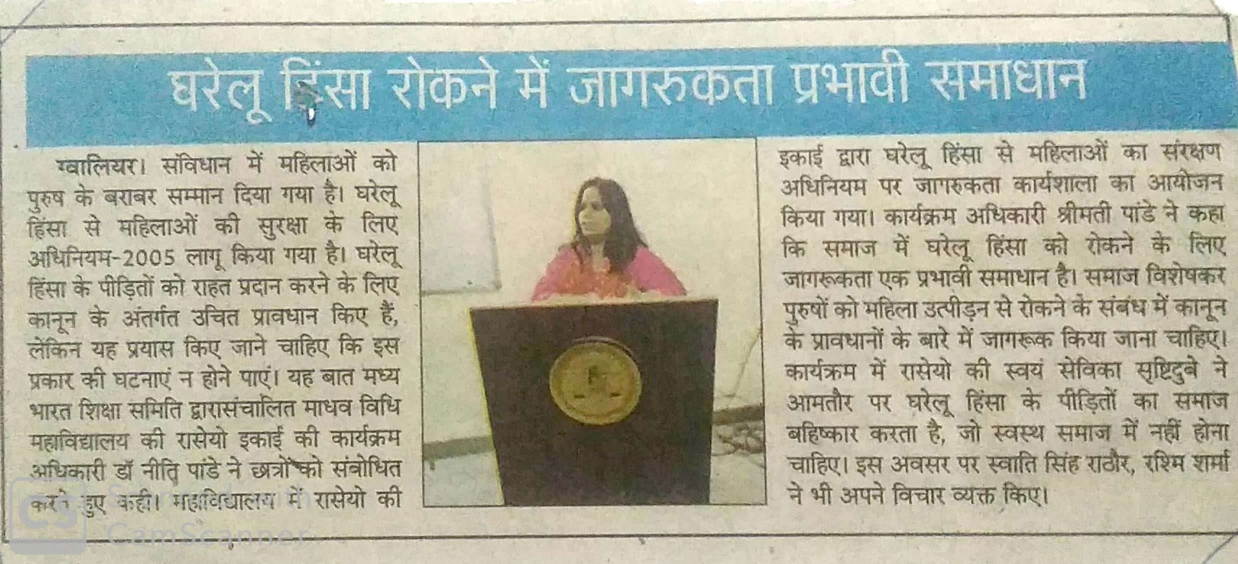 आईक्यूएसी सेल की सुपर विजन में माधव विधि महाविद्यालय में राष्ट्रीय सेवा योजना इकाई के द्वारा दिनांक 23/2/ 2020 को घरेलू हिंसा रोकने पर कार्यशाला आयोजित की गई जिसमें मुख्य वक्ता के रूप में उपस्थित रहीं।