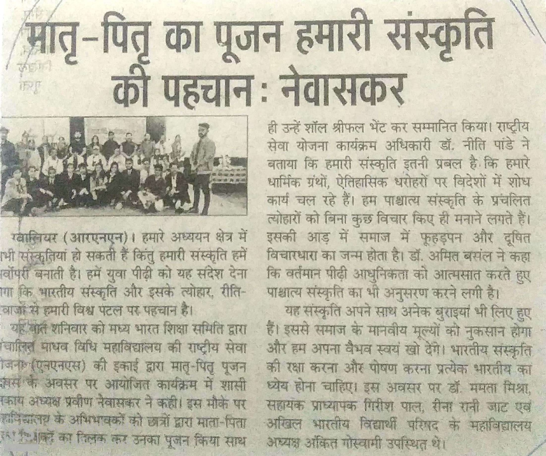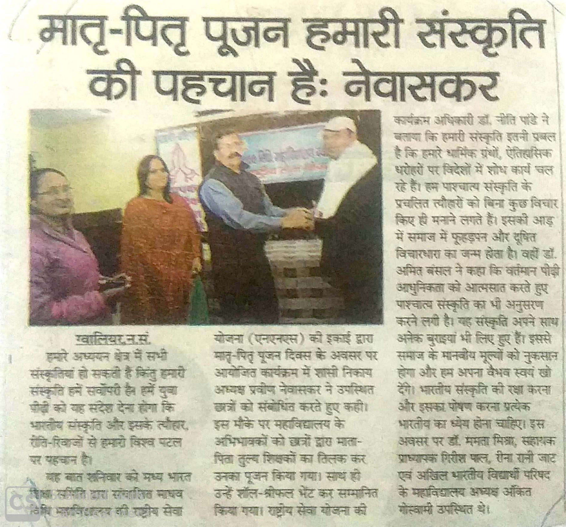 आइक्यूएसी सेल के सुपर विजन में माधव विधि महाविद्यालय में दिनांक 15/2/ 2020 को मातृ पितृ पूजन दिवस का आयोजन किया गया जिसमें मुख्य अतिथि के रुप में एडवोकेट प्रवीण नेवासकर जी उपस्थित रहे।