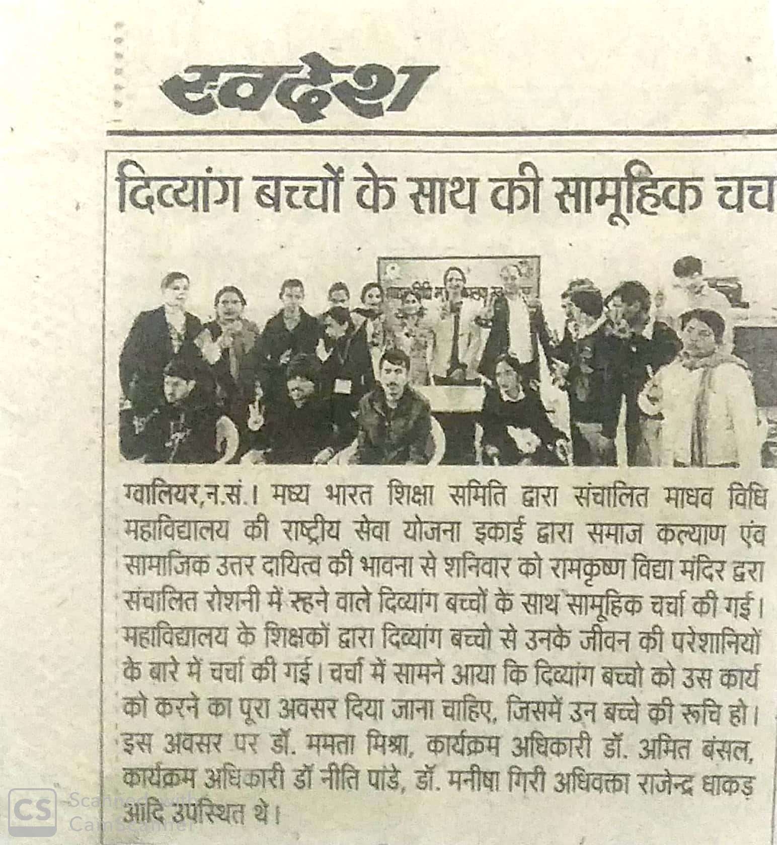 आइक्यूएसी सेल के सुपरविजन में माधव विधि महाविद्यालय में दिनांक 22/2/ 2020 को समाज कल्याण सामाजिक उत्तरदायित्व की भावना से राम कृष्ण विद्या मंदिर द्वारा संचालित रोशनी बढ़ाने वाले दिव्यांग बच्चों पर परिचर्चा की गई।