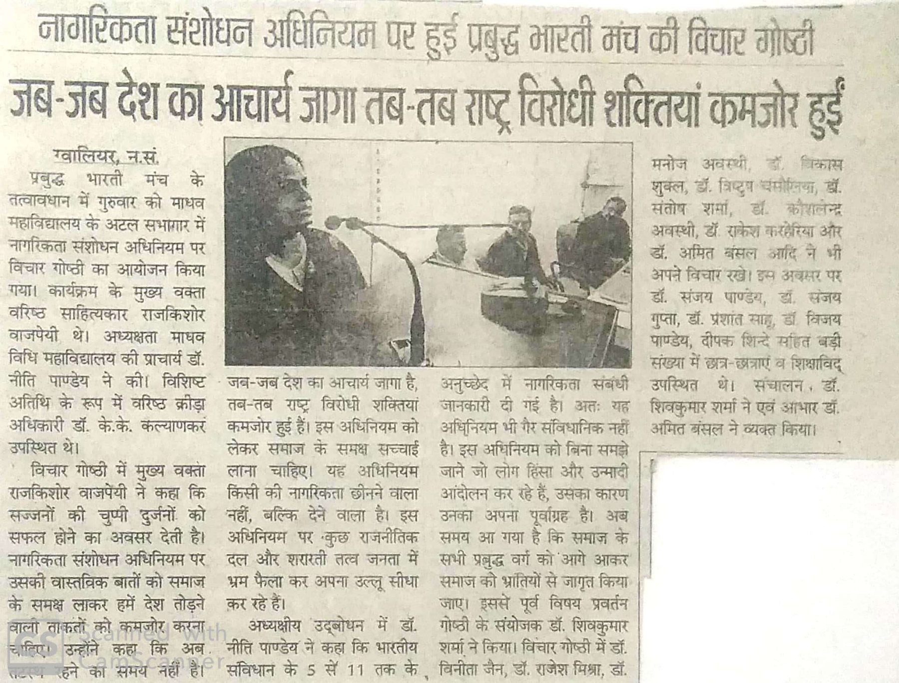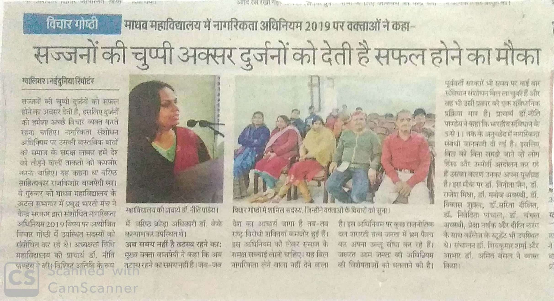आइक्यूएसी सेल के सुपरविजन में माधव विधि महाविद्यालय में राष्ट्रीय सेवा योजना इकाई द्वारा दिनांक 19/12 /2019 को नागरिक अधिनियम पर विचार संगोष्ठी का कार्यक्रम किया गया जिसमें मुख्य वक्ता के रूप में राजकिशोर वाजपेई जी विशिष्ट अतिथि के रूप में वरिष्ठ क्रीडा अधिकारी डॉक्टर के. के. कल्याणकर जी उपस्थित रहे । इस कार्यक्रम में मुख्य रूप से एनएसएस अधिकारी एवं प्राचार्य डॉक्टर ने की पांडेय जी उपस्थित रही।