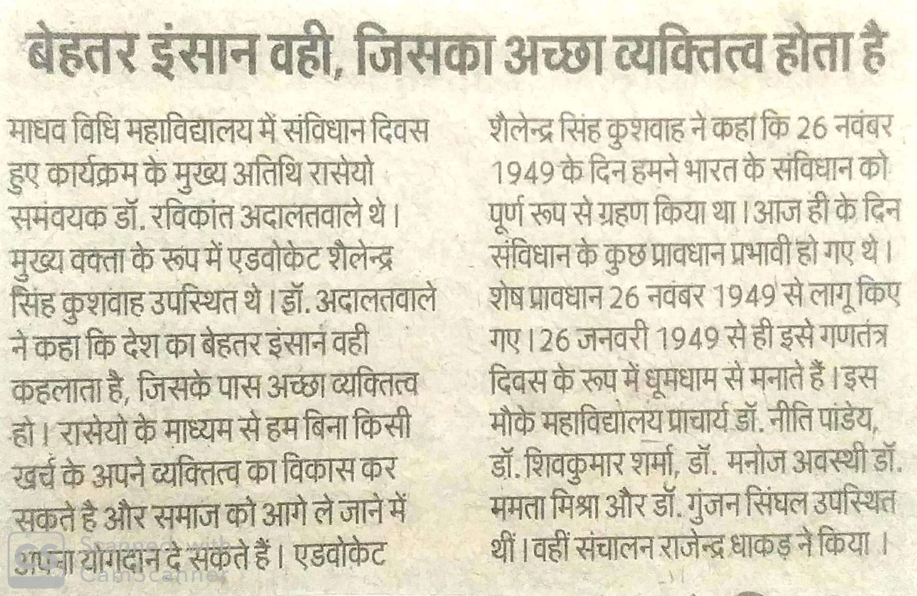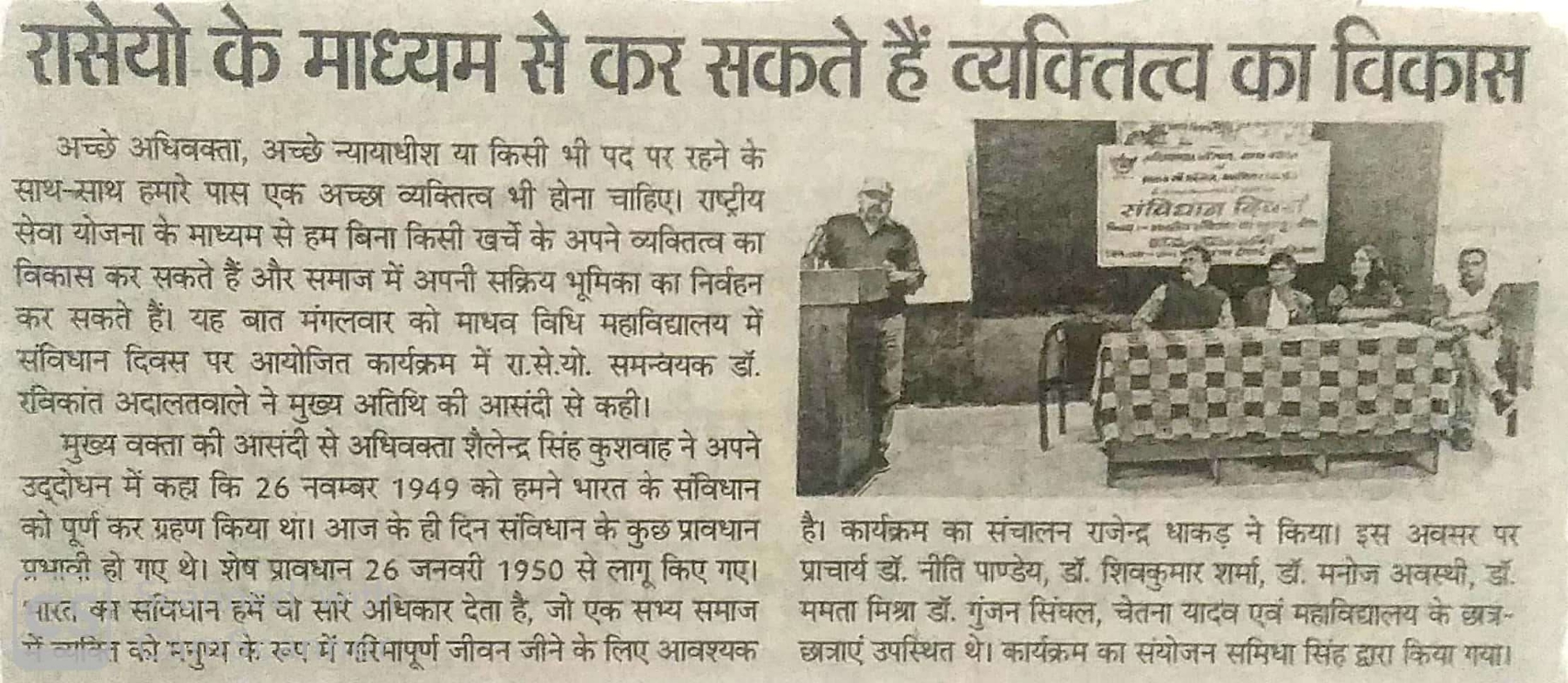 आईक्यूएसी कॉल के सुपर विजन में माधव विधि महाविद्यालय में राष्ट्रीय सेवा योजना इकाई के द्वारा संविधान दिवस कार्यक्रम का आयोजन किया गया जिसमें मुख्य अतिथि के रुप में रविकांत अदालत वाले जी और अधिवक्ता शैलेंद्र सिंह कुशवाहा जी उपस्थित रहे।