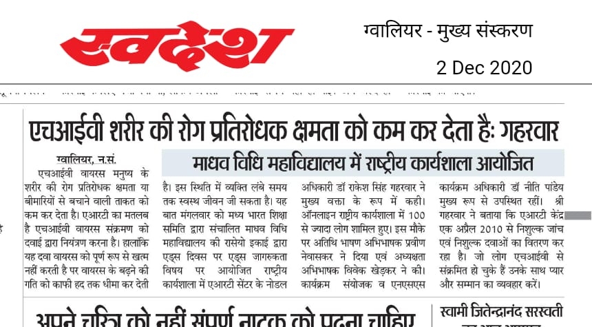 आइक्यूएसी सेल के सुपर विजन में माधव विधि महाविद्यालय में राष्ट्रीय सेवा योजना इकाई द्वारा दिनांक 1/12/2020 को एड्स दिवस पर "एड्स अवेयरनेस" विषय पर राष्ट्रीय कार्यशाला का आयोजन किया गया। इस अवसर पर मुख्य वक्ता के रूप में डॉ राकेश सिंह गहरवार जी उपस्थित रहे।