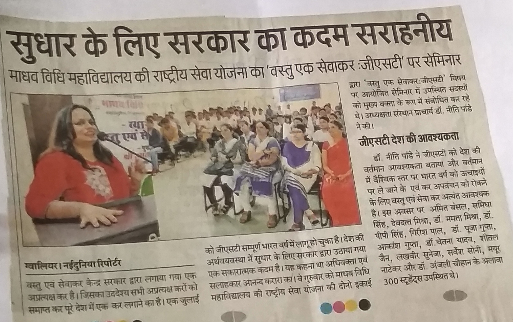 आइक्यूएसी सेल  के सुपर विजन में राष्ट्रीय सेवा योजना इकाई द्वारा माधव विधि महाविद्यालय में जीएसटी विषय पर दिनांक 24/8/2017 को व्याख्यान का आयोजन किया गया इसमें मुख्य वक्ता के रूप में अधिवक्ता वरिष्ठ सलाहकार एडवोकेट आनंद करारा जी रहे एवं कार्यक्रम की अध्यक्षता प्राचार्य डॉ नीति पांडेय  जी ने की।