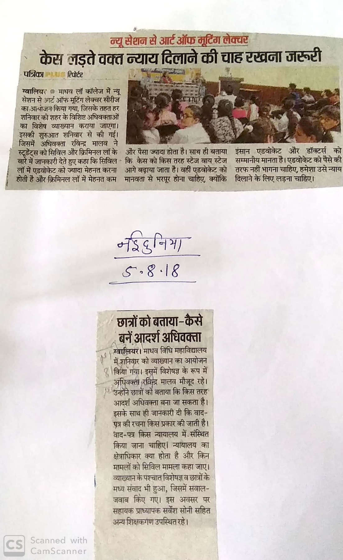 आईक्यूएसी सेल के सुपर विजन में माधव विधि महाविद्यालय में दिनांक 4/8/2018 को आर्ट ऑफ मुटिंग विषय पर लेक्चर का आयोजन किया गया। जिसमें मुख्य अतिथि के रुप में अधिवक्ता रविंद्र मालव जी उपस्थित रहे।