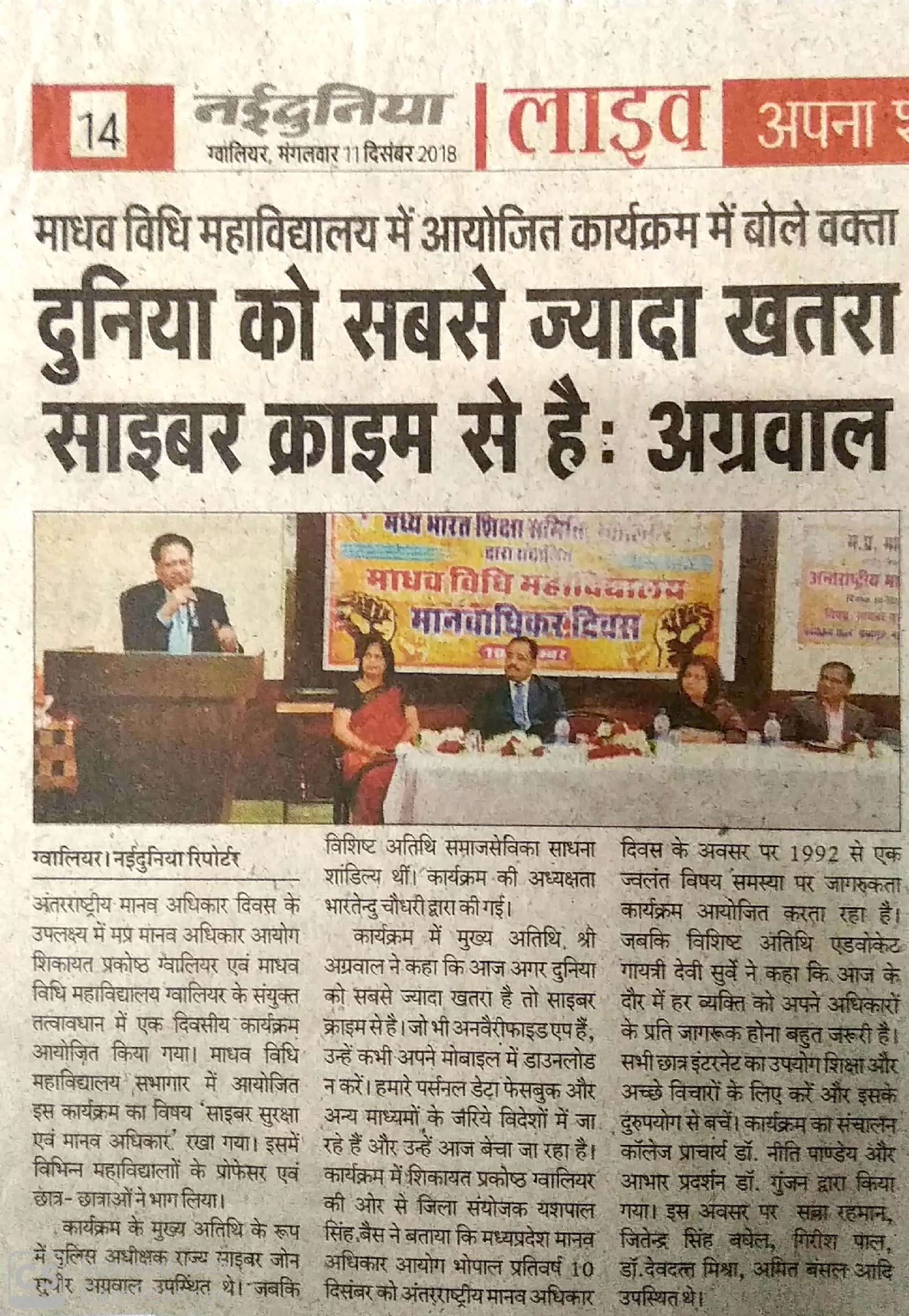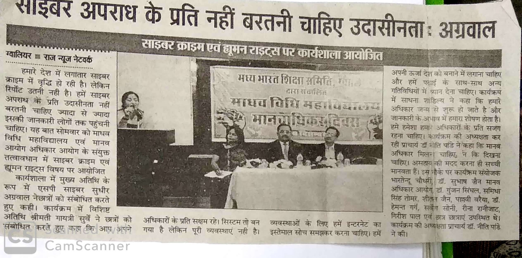 आइक्यूएसी सेल के सुपरविजन में माधव विधि महाविद्यालय में दिनांक 10/12/2018 को मानव अधिकार दिवस पर कार्यशाला का आयोजन किया गया जिसमें मुख्य वक्ता के रूप में पुलिस अधीक्षक राज्य साइबर जोन सुधीर अग्रवाल एवं विशिष्ट अतिथि समाज सेविका साधना शांडिल्य जी उपस्थित रही।