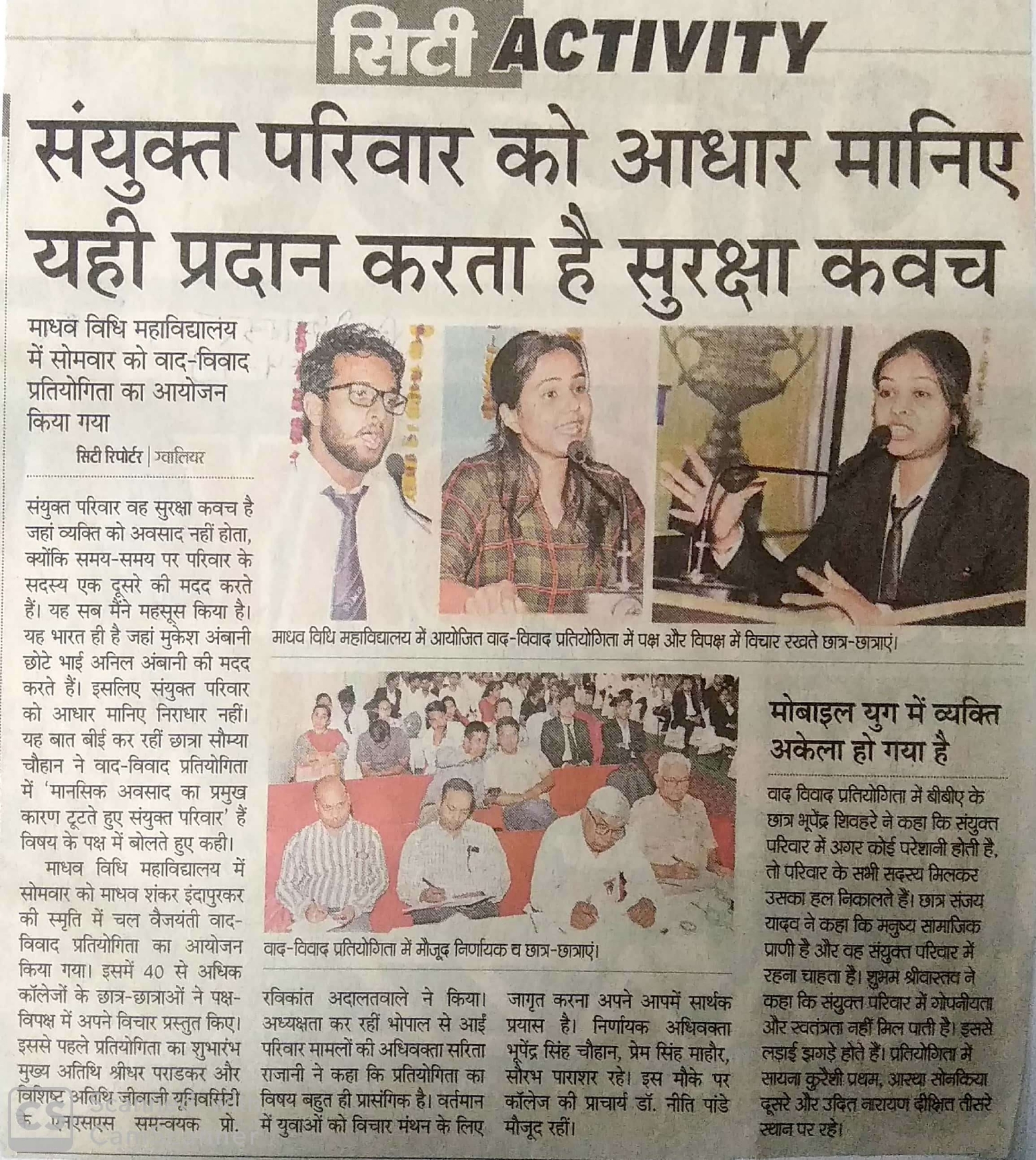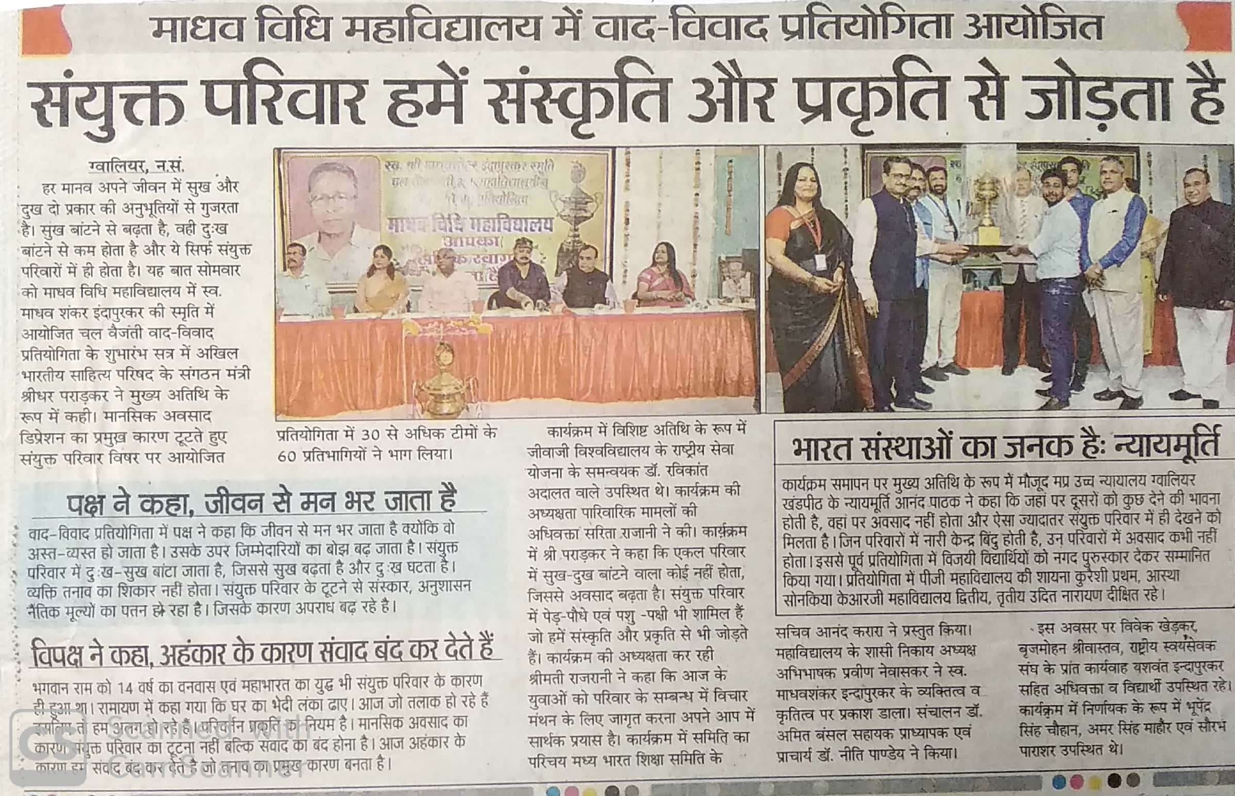 आईक्यूएसी सेल के सुपरविजन माधव विधि महाविद्यालय में दिनांक 1/4/2019 को वाद विवाद प्रतियोगिता का आयोजन किया गया। इसमें उद्घाटन सत्र में अतिथि अभा साहित्य परिषद के संगठन मंत्री श्रीधर  पराड़कर जी उपस्थित रहे एवं विशिष्ट अतिथि एनएसएस संयोजक जेयू रविकात अदालत वाले जी उपस्थित रहे। समापन सत्र में एम.पी.एच.सी. न्यायमूर्ति आनंद पाठक जी उपस्थित रहे।