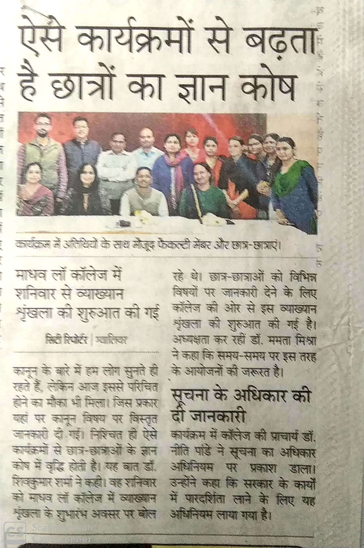आईपीएस की सैलरी सुपरविजन में माधव विधि महाविद्यालय में दिनांक 3 2019 को व्याख्यान आयोजित किया गया जिसमें मुख्य अतिथि के रुप में डॉक्टर शिवकुमार शर्मा जी एवं मुख्य वक्ता के रूप में डॉक्टर नीति पांडेय जी उपस्थित रहे।